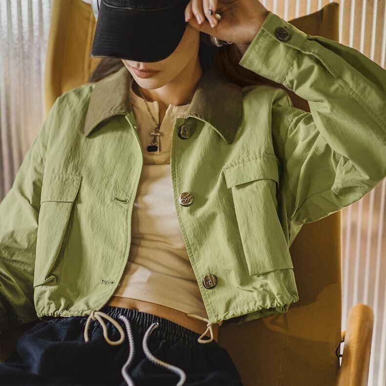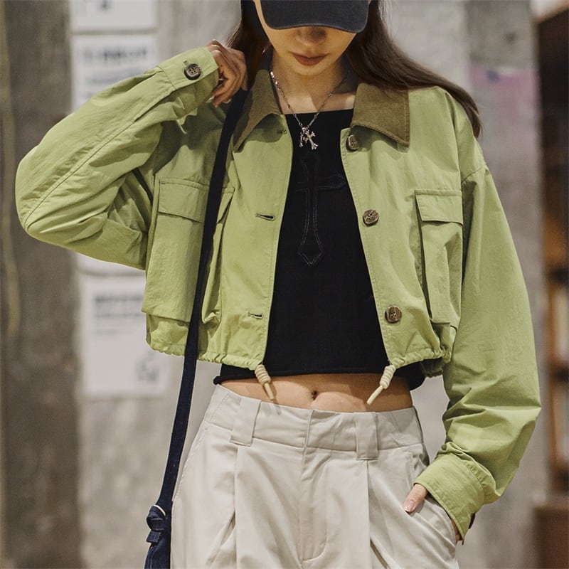 レトログリーンのショート丈ジャケット。