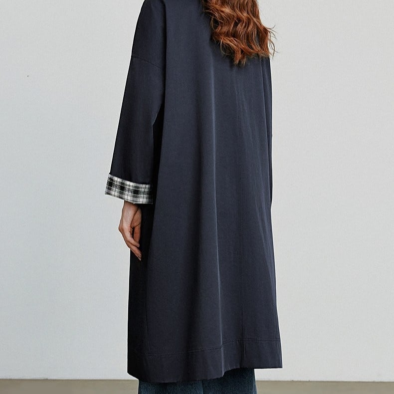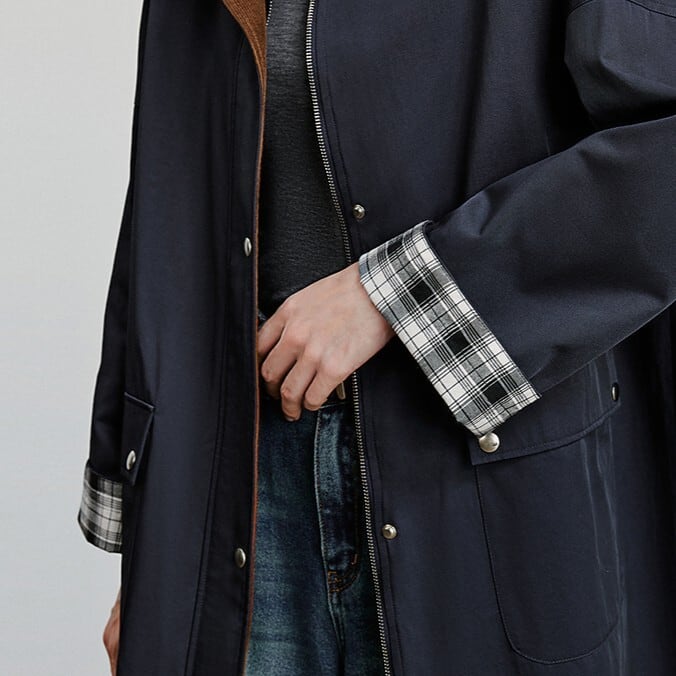 クラシックなネイビーカラーに、ブラウンの襟と袖裏のチェック柄が映えるロングコート。