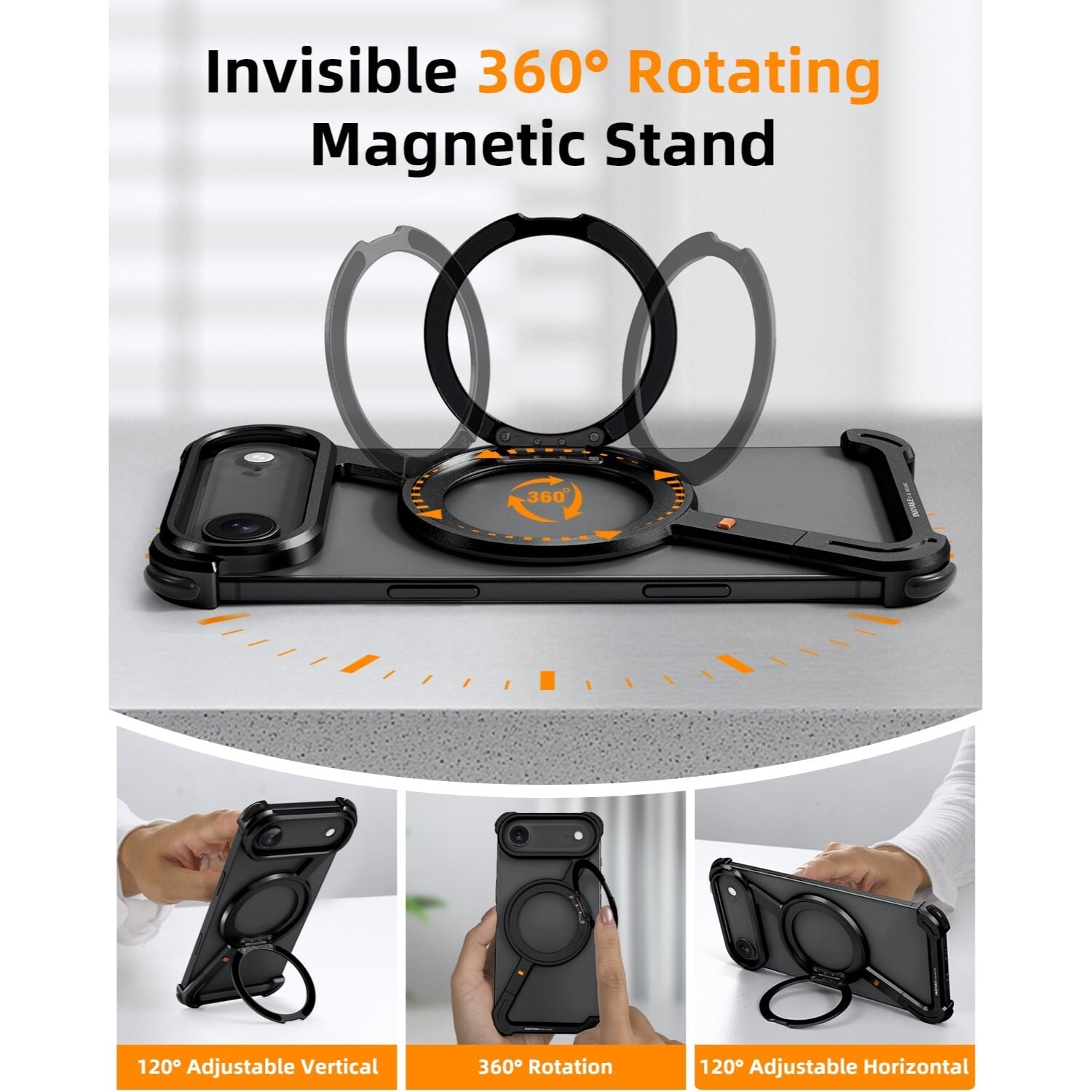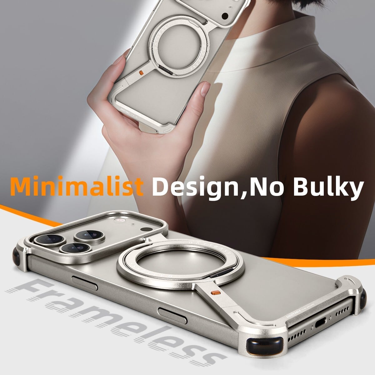 フレームレス構造と360°回転スタンドが融合した、機能美あふれるメタルケース。