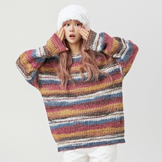色の重なりが映えるレインボーニット。