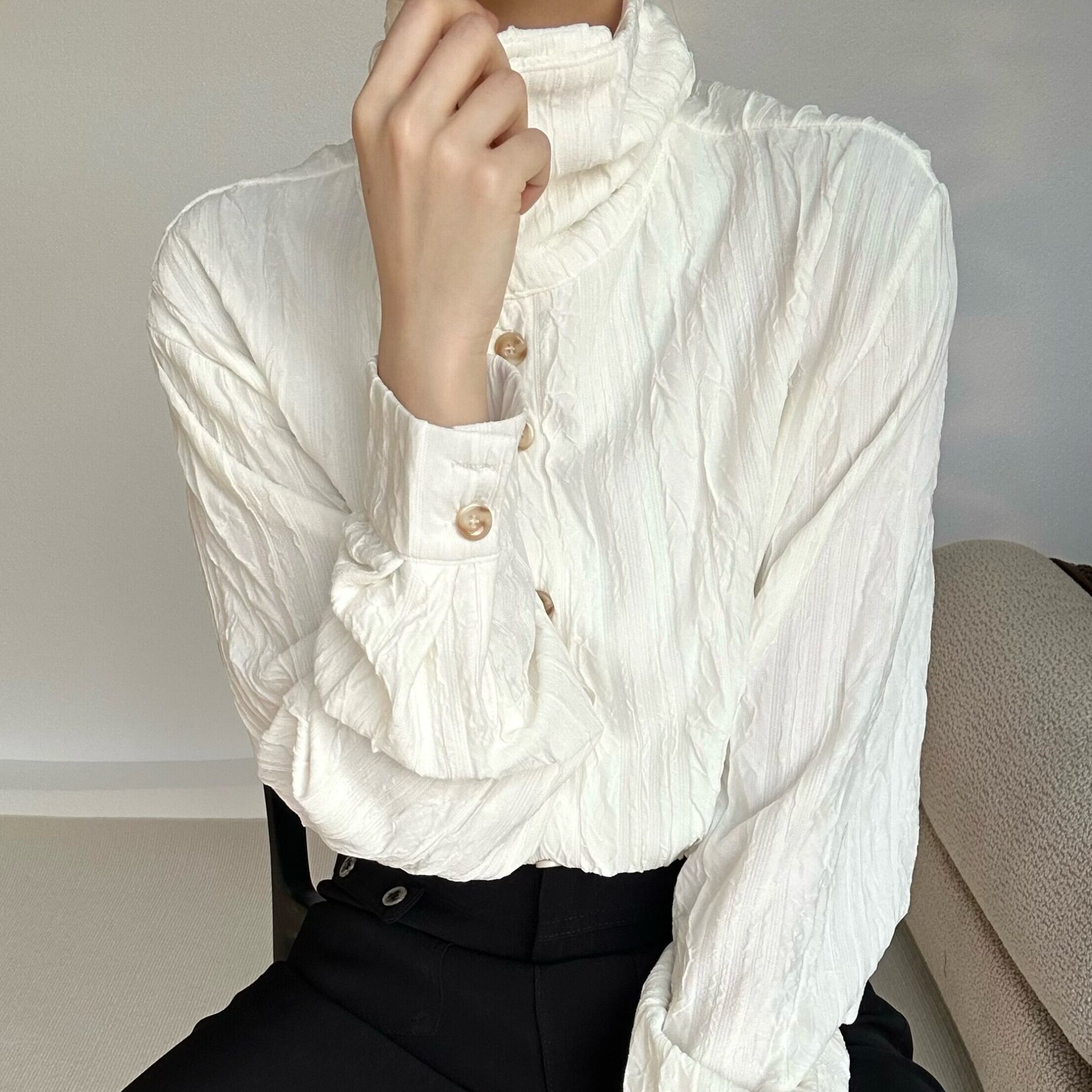 立体感のあるリンクル加工の、1枚で表情が決まるスタンドカラーシャツ。