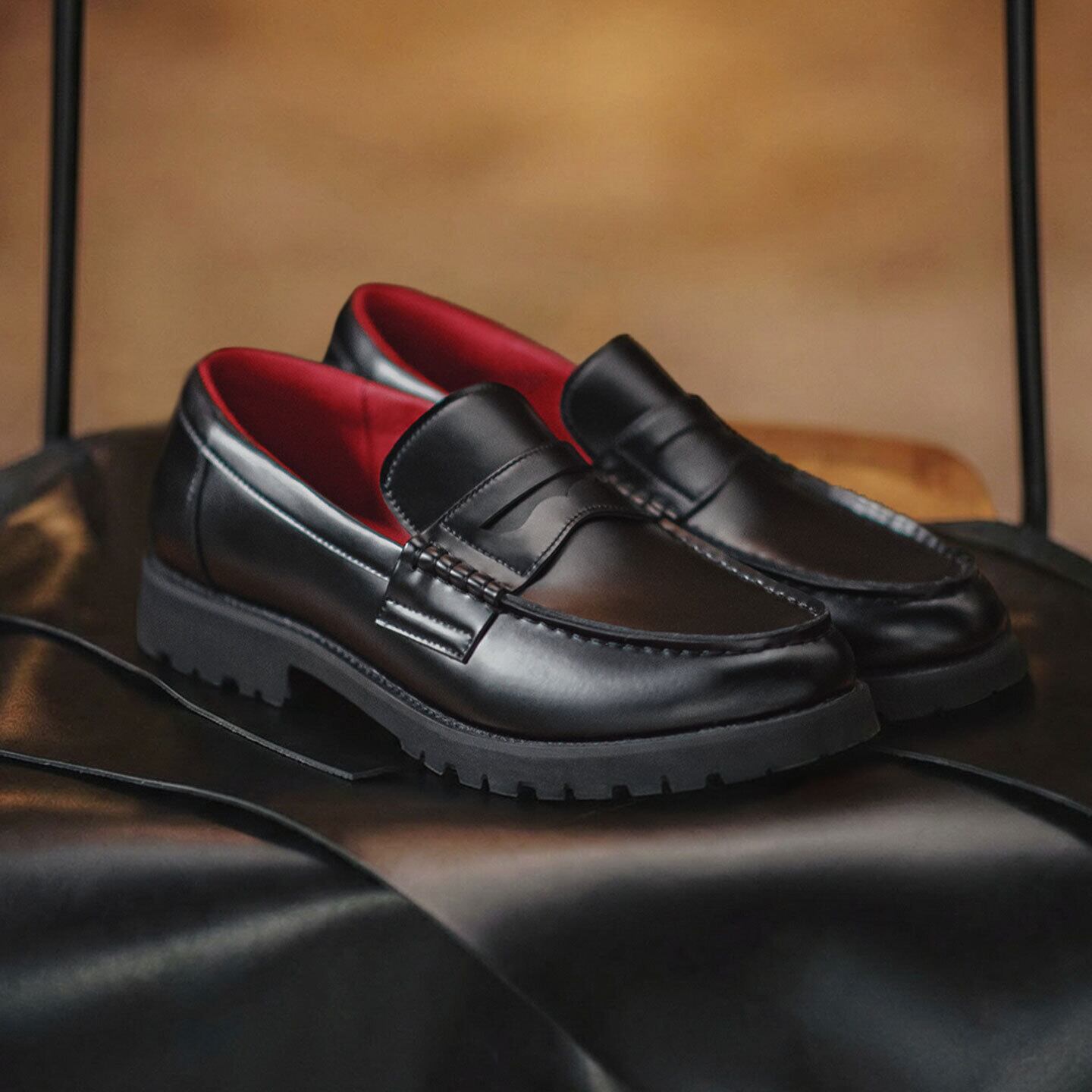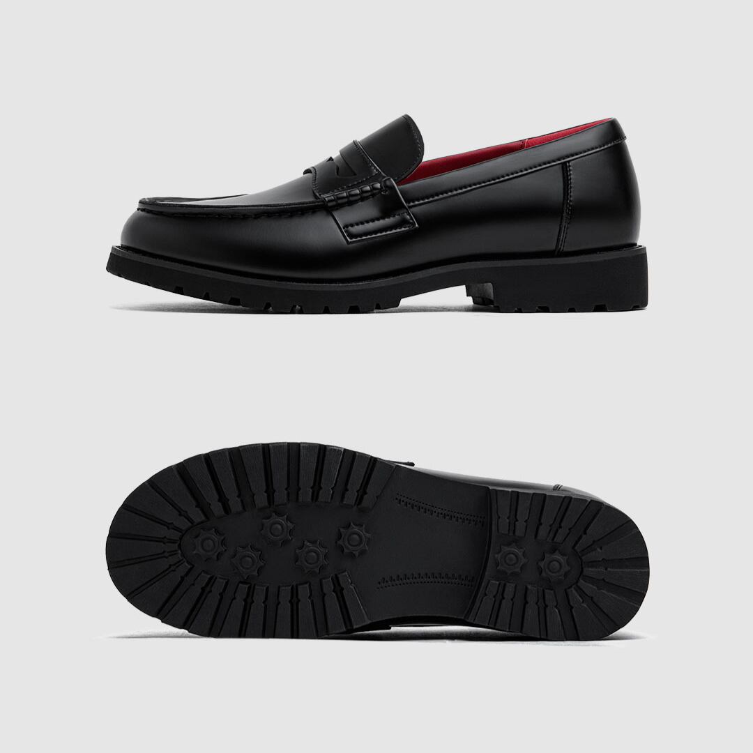 シャープなレザーの艶と、引き締まったシルエットが印象的なローファー。