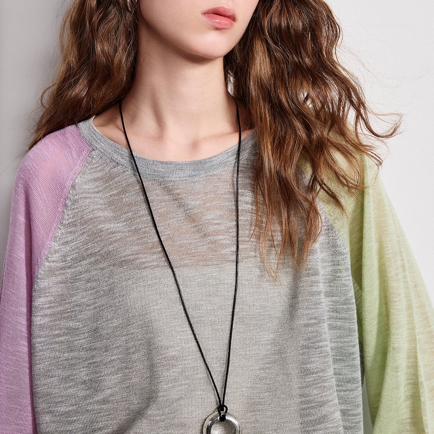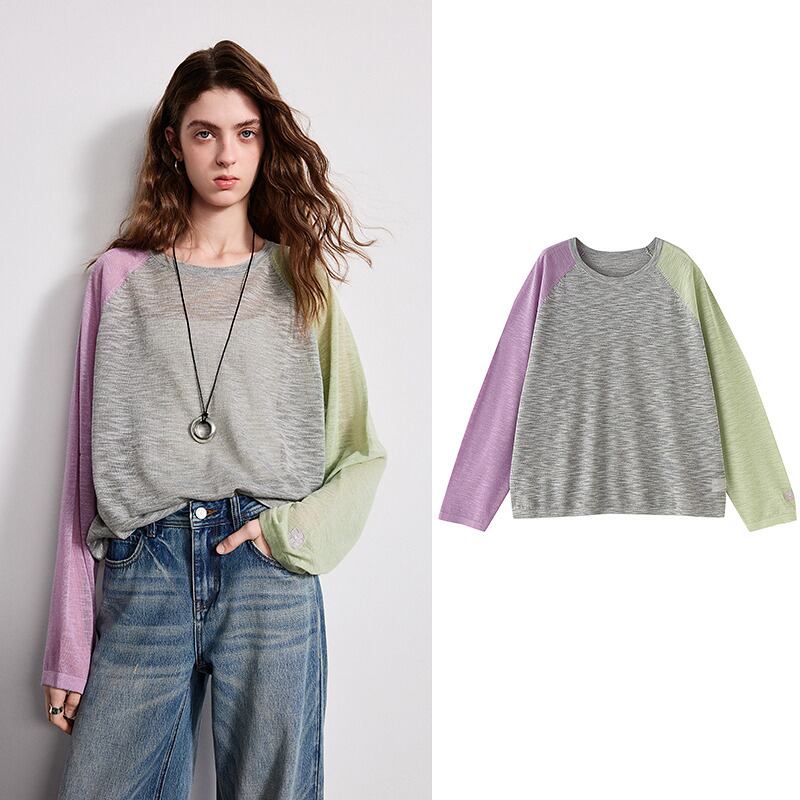 左右で袖の色を変えたアシンメトリーデザインが印象的なルーズトップス。