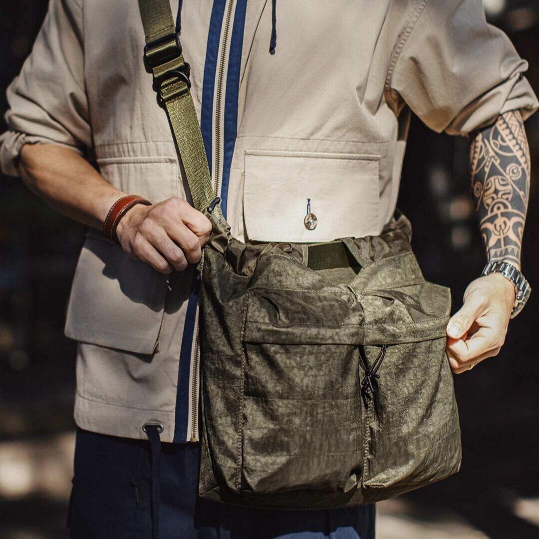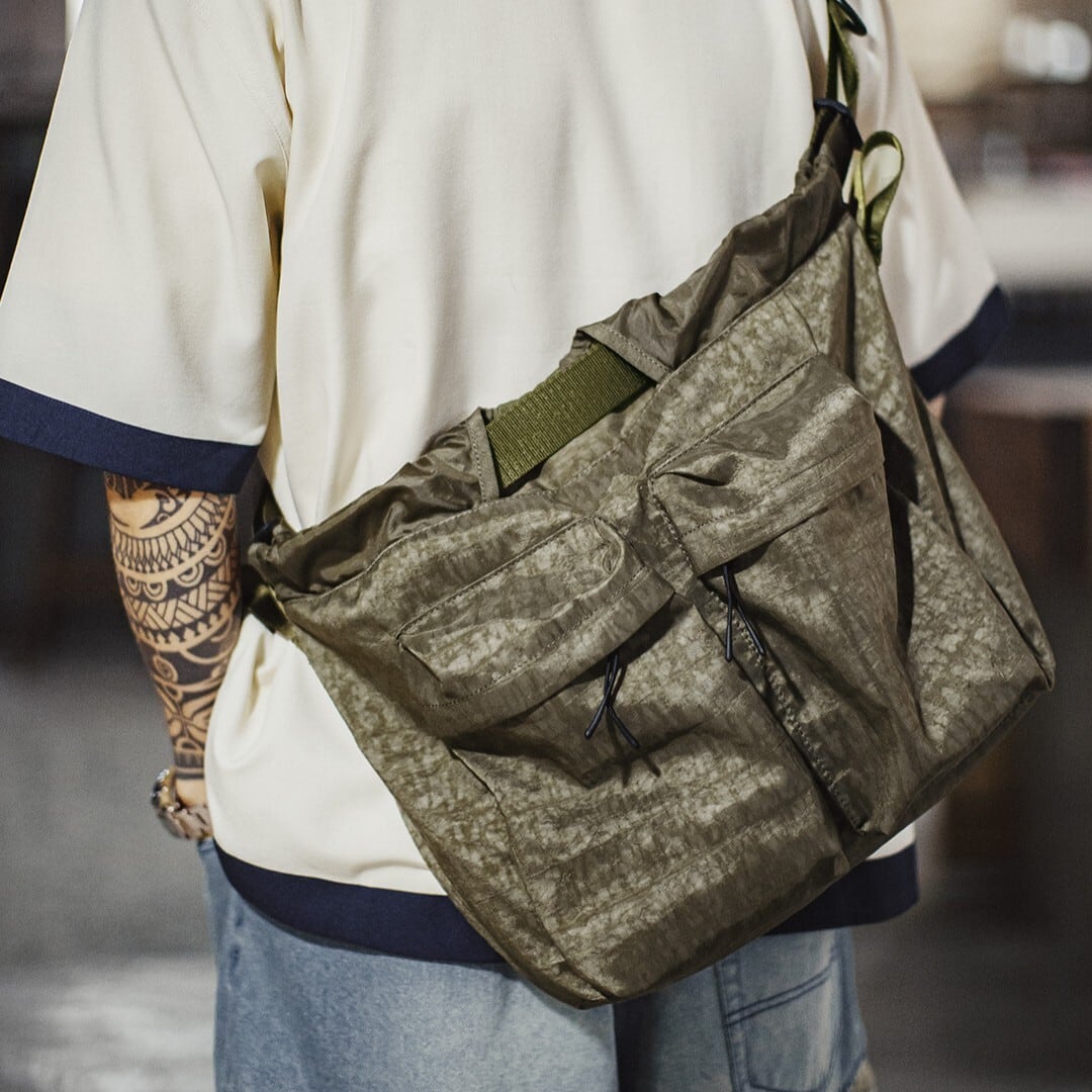 立体的なポケット配置が目を引く、存在感のあるショルダーバッグ。
