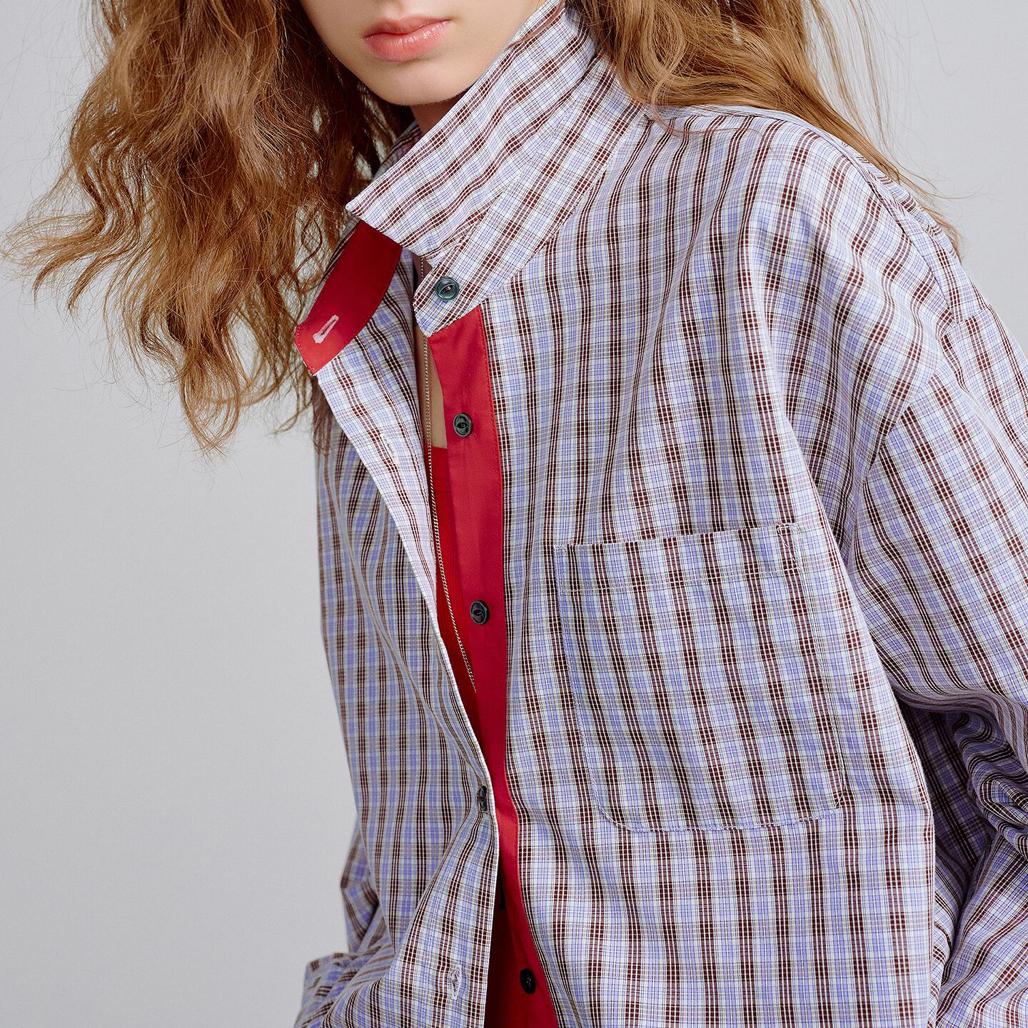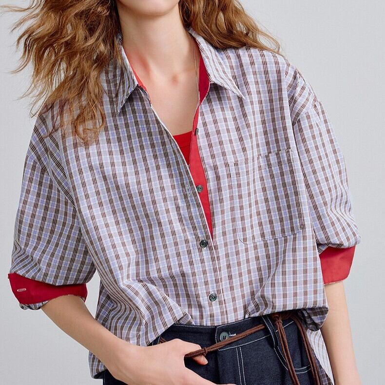 クラシックなチェックに、鮮やかな赤を差し込んだバイカラーシャツ。