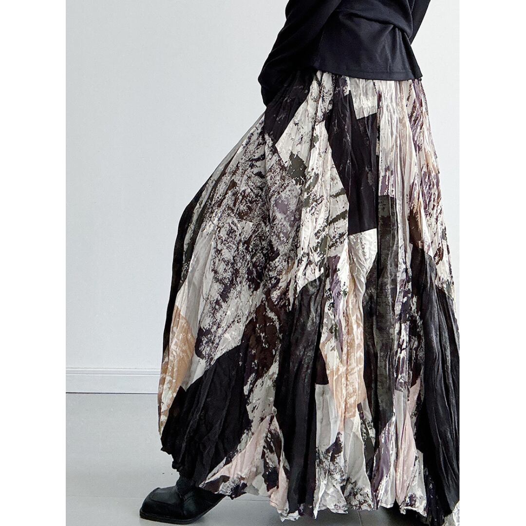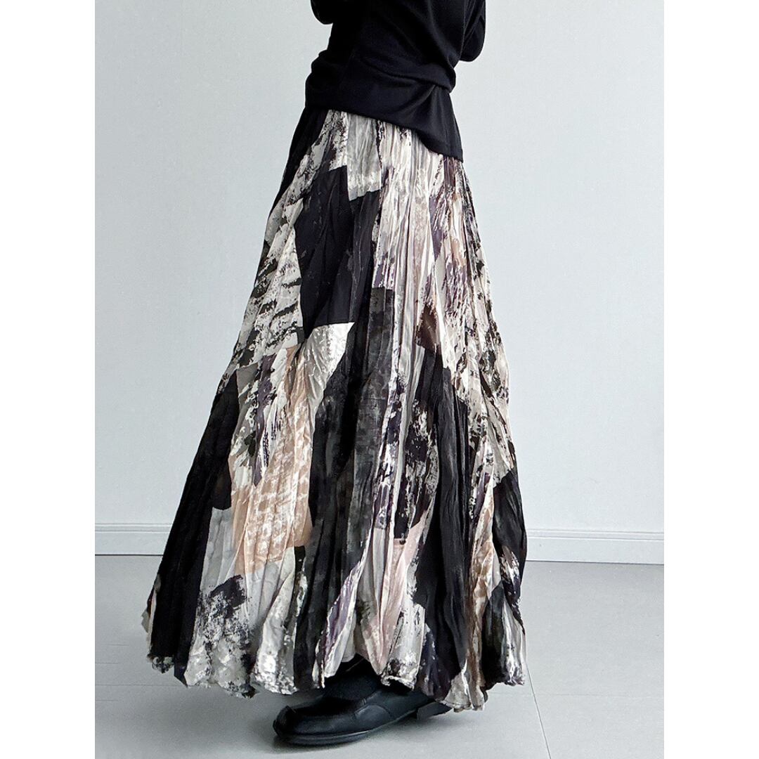 モノクロのアート柄が印象的なプリーツロングスカート。