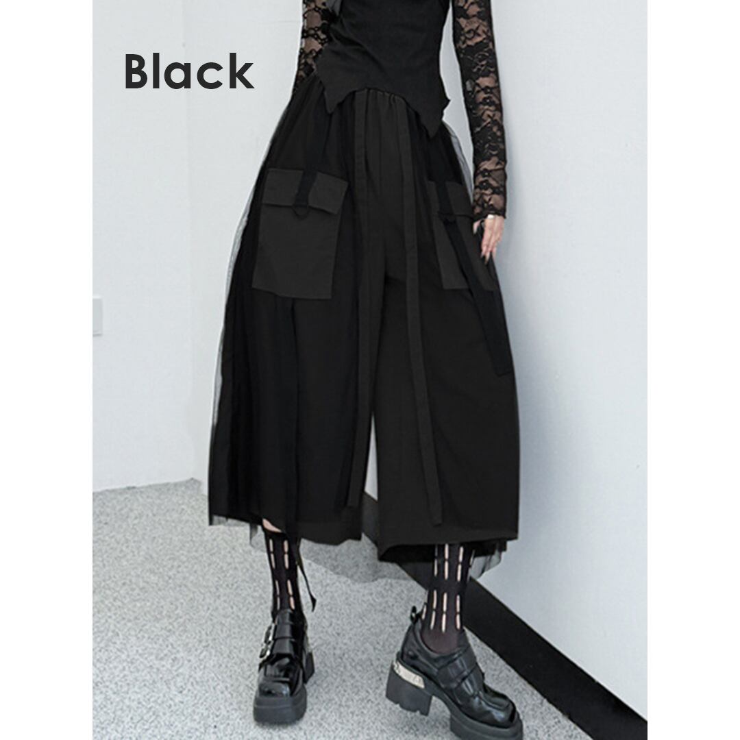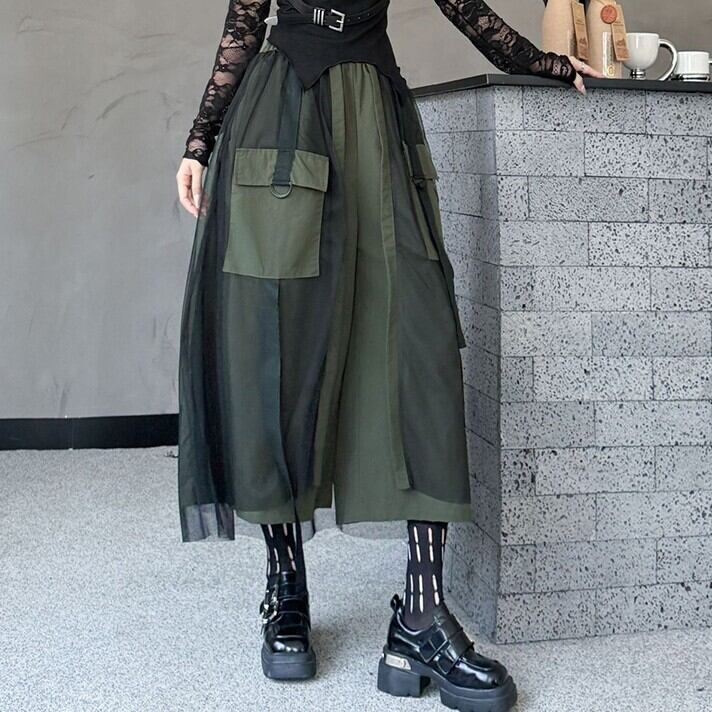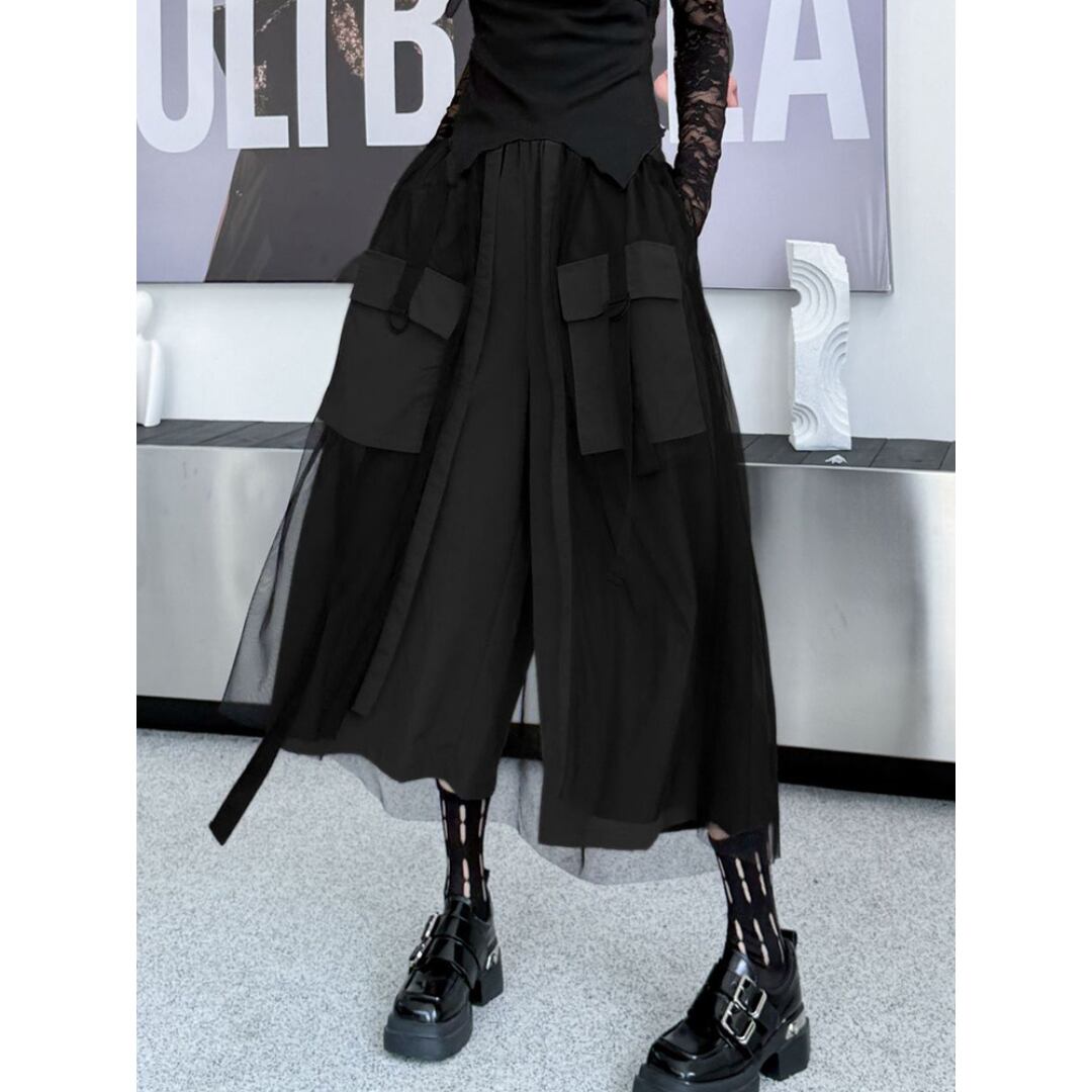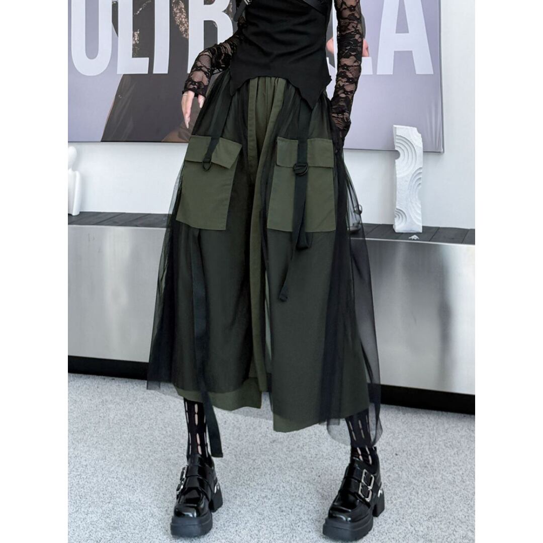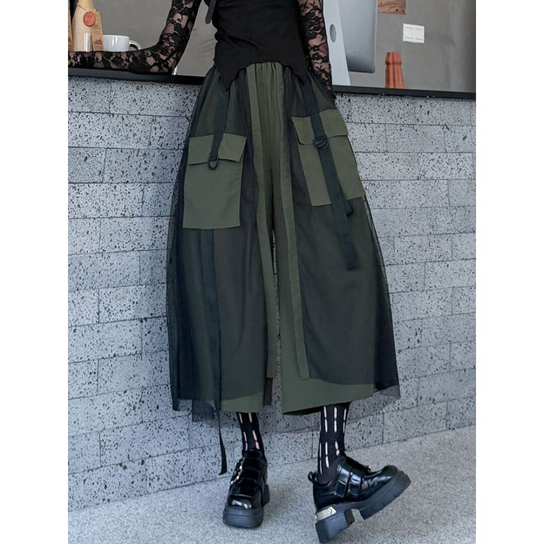 透け感のある素材と、無骨なカーゴを組み合わせたワイドパンツ。